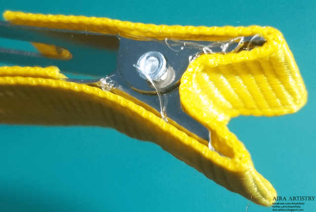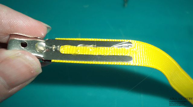 Next you will finish the rest of the covering in one swoop. This one requires a touch more quickness than the previous step and can be broken down into parts if you desire, but it is difficult to get glue onto the ribbon once you start wrapping on the handles. As shown above, I put the glue directly on the ribbon for this step. You will then smooth it out on the top and proceed to smooth it out the entire handle portion, with it ending wrapped around slightly on the bottom-side of the clip. This is a bit harder to explain, so here’s a close-up of what it should look like: