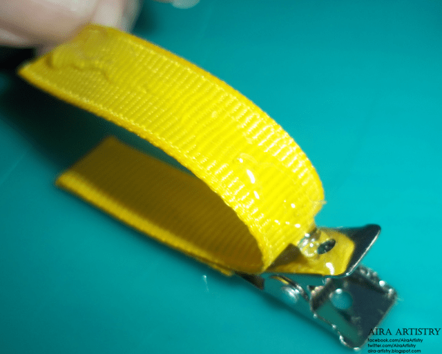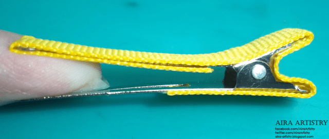 Cut your grosgrain ribbon at 4.5 inches. If you have fray check, now would be a great time to apply tiny amounts to either end. Open up your clip and slip the ribbon inside, ensuring that the open area between the two prongs has ribbon across the entire length of it. You don’t need to push the ribbon all the way inside, just far enough to cover that open area.