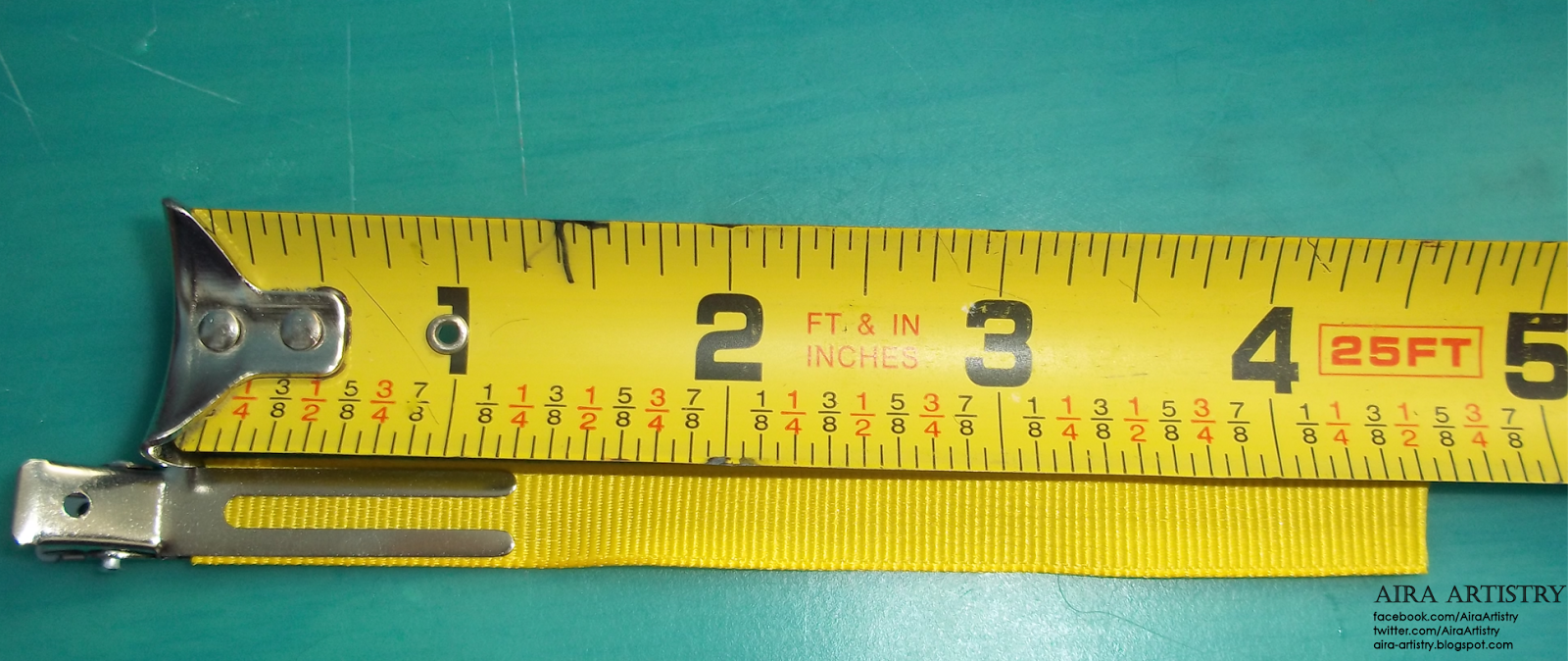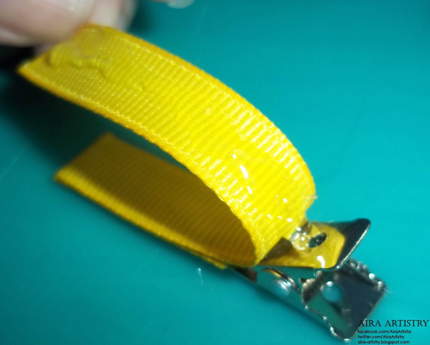Cut your grosgrain ribbon at 4.5 inches. If you have fray check, now would be a great time to apply tiny amounts to either end. Open up your clip and slip the ribbon inside, ensuring that the open area between the two prongs has ribbon across the entire length of it. You don’t need to push the ribbon all the way inside, just far enough to cover that open area.