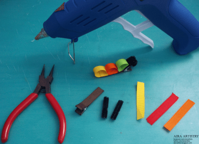 First you want to hot glue the three 3/8″ grosgrain strips into rolls, as pictured above. Try not to have too much overlap where the ends meet or it may be difficult to place them on the clip.