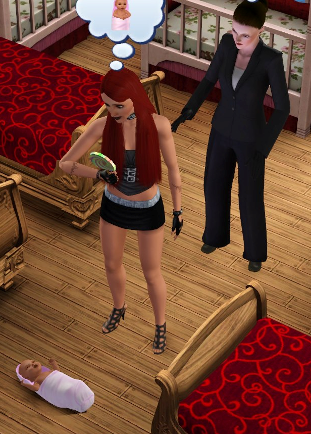 I decided to have fun with the paparazzi and quickly befriended and performed “try for baby” with one. (Yes, I realize that breeding a family goes against playing one sim at a time, but doing it this way did allow me to slowly get accustomed to playing multiple sims as they slowly grew up and their needs expanded over time.) Sure enough, within a sim-day Ginni was knocked up and received time off from her criminal career job.
