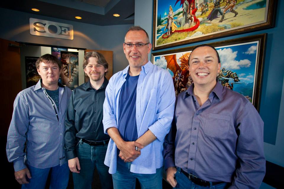 EverQuest Next team members Jeff Butler (Creative Director), Terry Michaels (Senior Producer), and Dave Georgeson (EQ Franchise Director of Development) with Gabor Szikszai (fantasy artist).