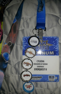 There isn’t anything crazy complex to these. I just shrunk down several logos for SOE games I play so that they’d fit a one-inch round cutout and was able to print ten per 4×6 photo sheet. Then I adhered them to the bottlecaps and added a jump ring to each.