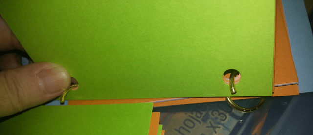 I also used a three-hole puncher; a one-hole puncher would be fine as well, though more tedious. Because the sheets were smaller than standard sheets I had to adjust the hole placements on my 3-hole puncher. I ended up with about 20 sheets inside and the two cover sheets, which can be easily expanded.
