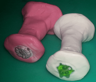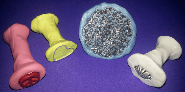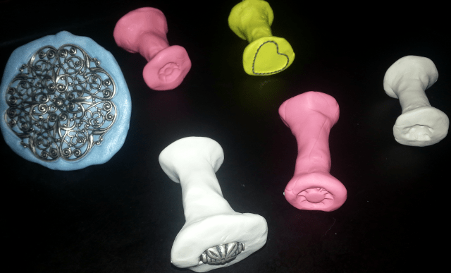 Roll the clay into a handle shape that works well for you, then gently push your objects into the end caps. Aside from the large blue tool I made, the rest of mine were double-ended to maximize my clay real estate.