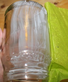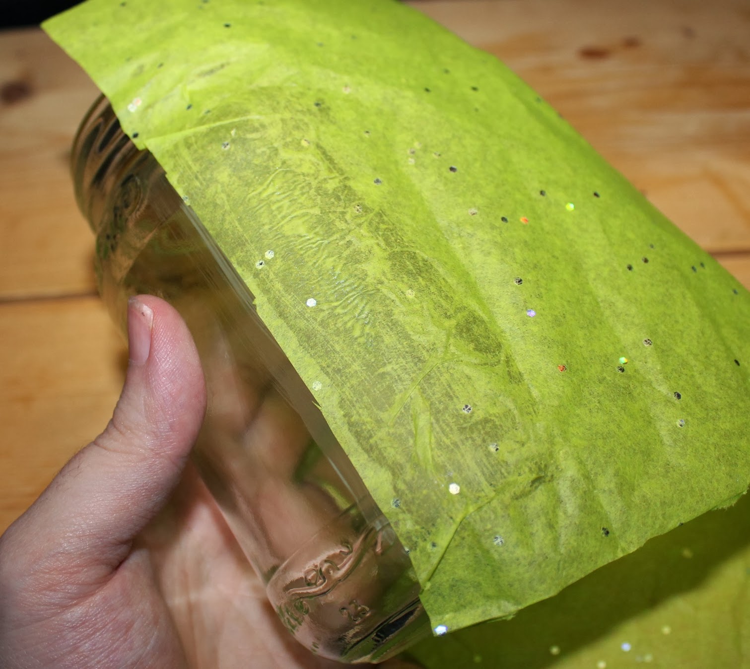 Size the tissue paper to the jar, leaving a bit of extra on the top and bottom to wrap over and under.