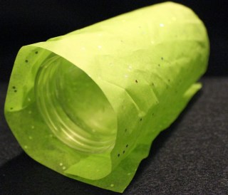 Apply a thin coat Mod Podge to the jar, working the tissue paper onto the jar as you work your way around. Try to keep it smoothed out, but remember that tissue paper tears very easily so once it’s glued, it’s glued!