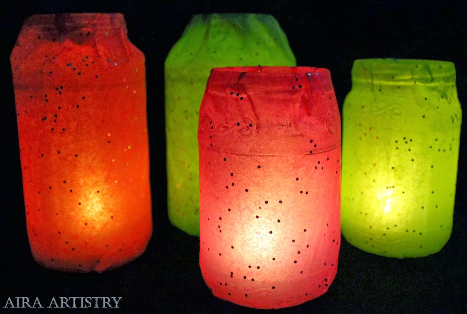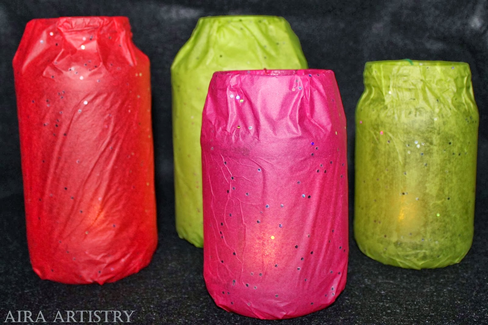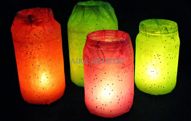 Once the tissue paper is all dry, you just add a light and you’re done! I had a pack of LED candles I got on clearance at K-Mart that work great for this. Since my jars are deep I decided to attach a length of embroidery floss to the lights so I can lift them in and out easier.