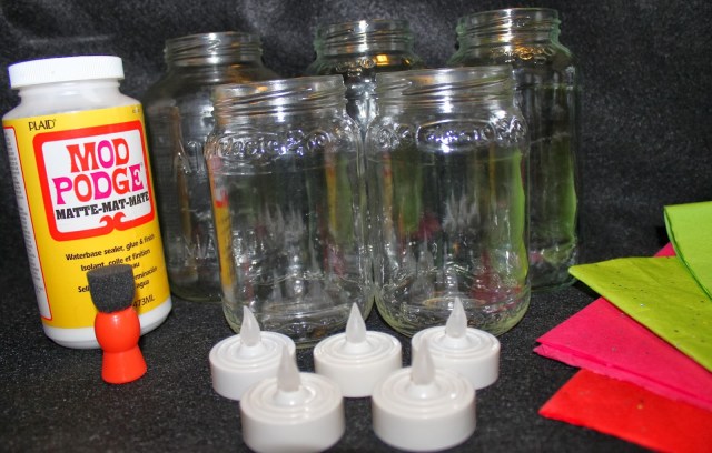 My day eleven project was Decorative Mason Jar Lights. The idea came from this pin by the Mod Podge Rocks Blog. Supplies are fairly simple: an empty jar (I used upcycled jars from spaghetti sauce and pickles), tissue paper, Mod Podge (or other craft glue), a paint brush, and some flameless lights. Chances are, you have a lot, if not all, of these supplies somewhere in your home already!