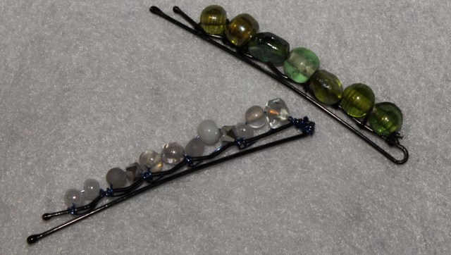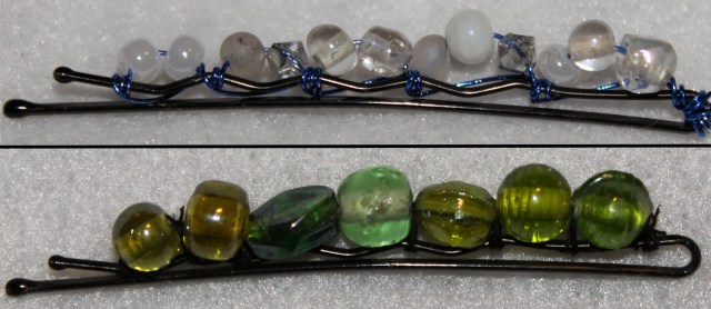 If I did it again with thread, the one thing I would change would be adding a wrap around the bobby pin with the thread between each bead instead of stringing them all on then wrapping back like the pin shows. They were really unstable until I did a wrap-around between each. Also, this happened way too often with the thread: