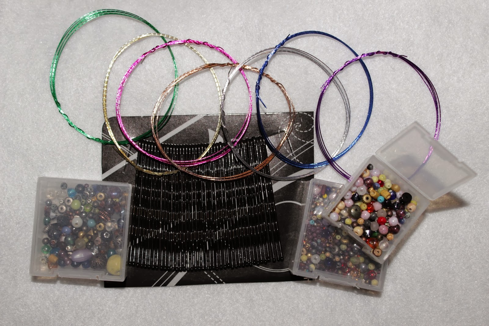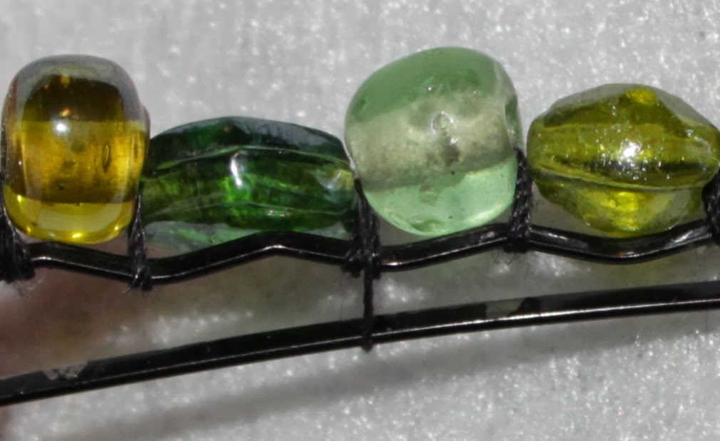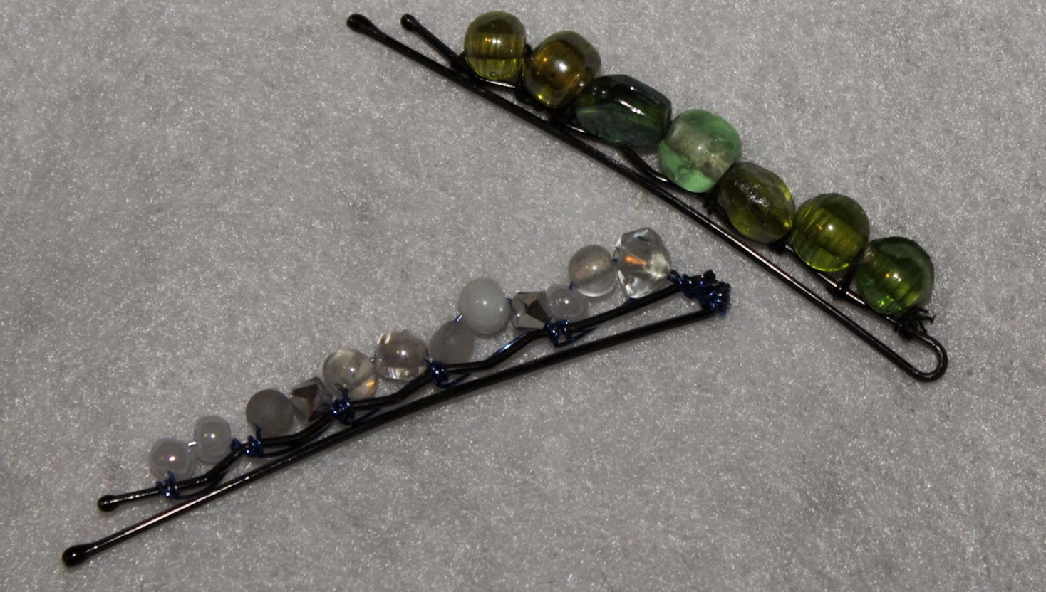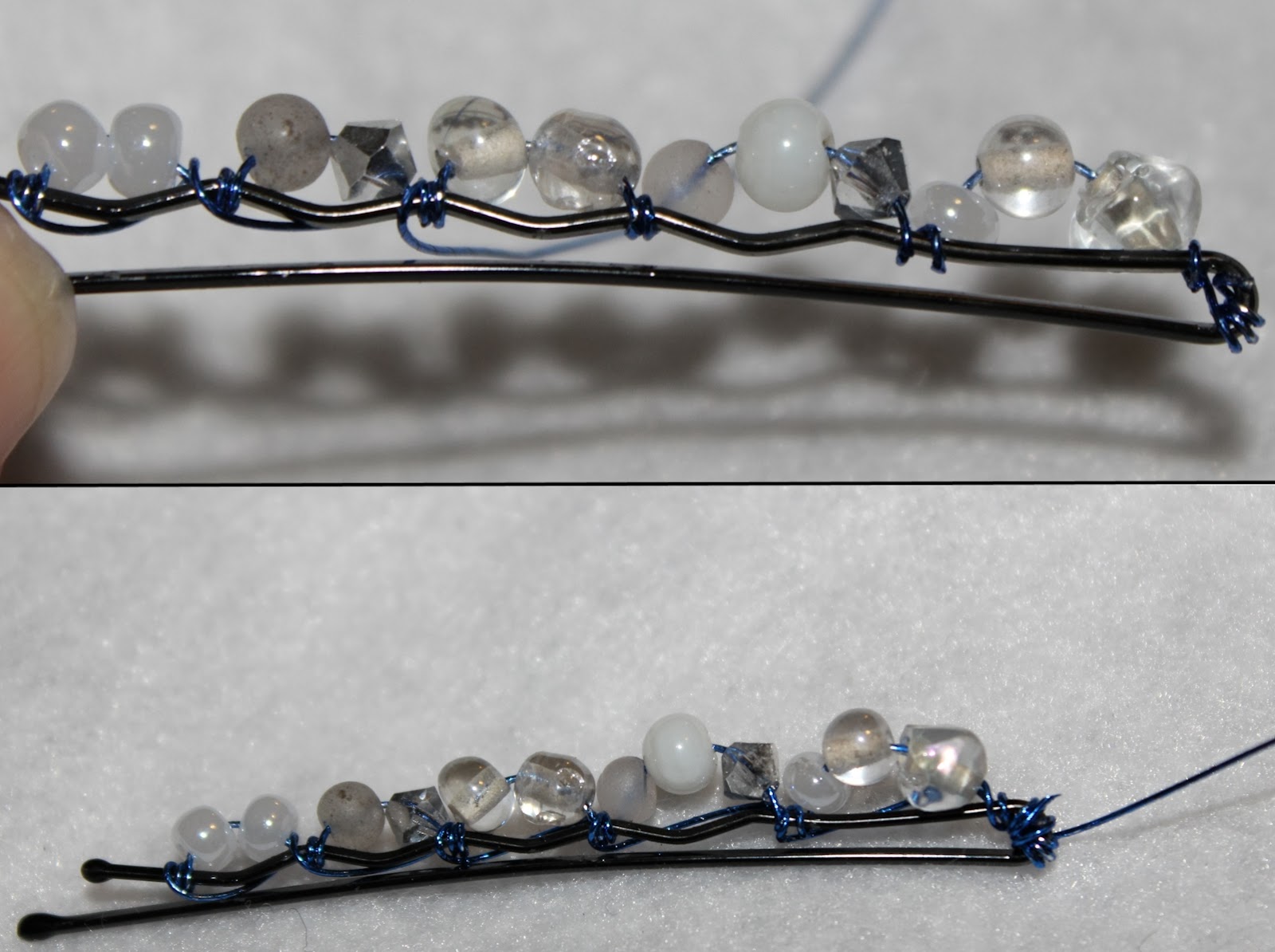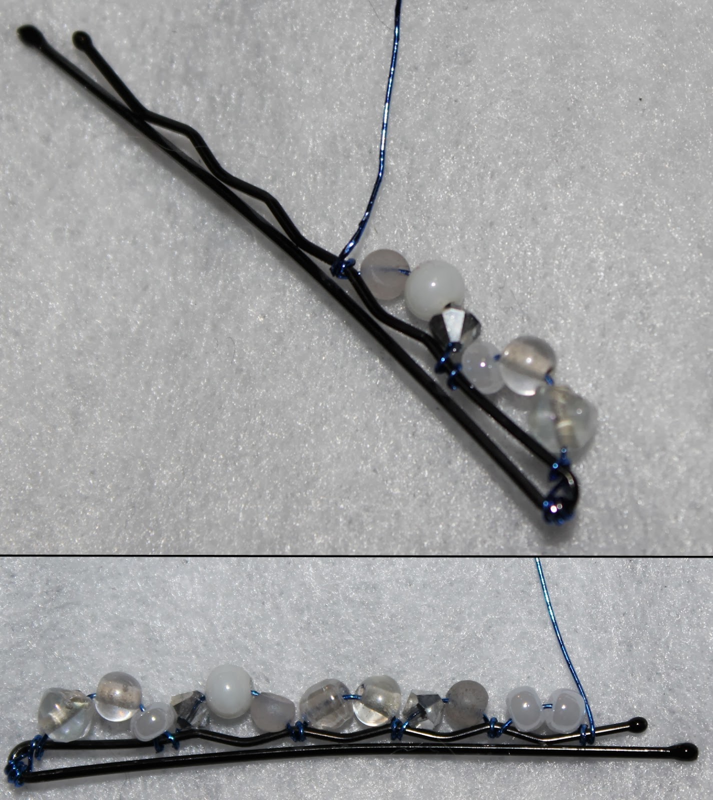 If I did it again with thread, the one thing I would change would be adding a wrap around the bobby pin with the thread between each bead instead of stringing them all on then wrapping back like the pin shows. They were really unstable until I did a wrap-around between each. Also, this happened way too often with the thread: