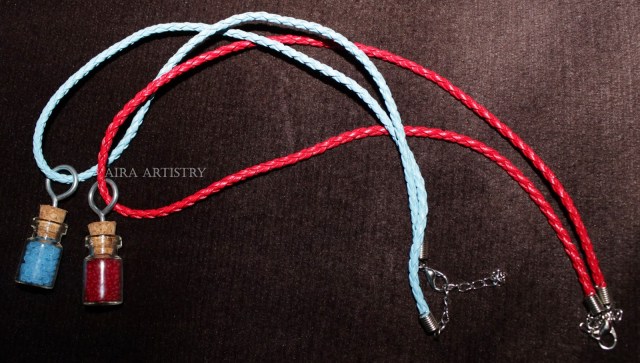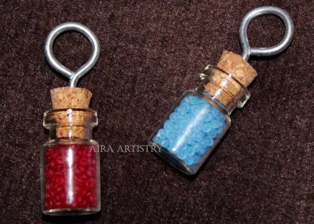 I’ve seen many bottle jewelry ideas on Pinterest. There are the candy bottles, a “message in a bottle”, health and mana potion earrings, and.. well really, there’s so many ideas out there! My original intent was to first try confetti pieces before trying beads, but as soon as I pulled them out my husband asked me if I was going to make some health and mana potions with my seed beads, so I rolled with that!