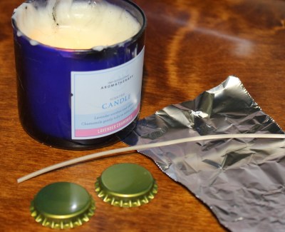 To start, I grabbed a wick (came in a five-pack and I just trimmed tiny lengths off of it), bottlecaps, a candle, and a bit of aluminum foil (to hold the wick upright).