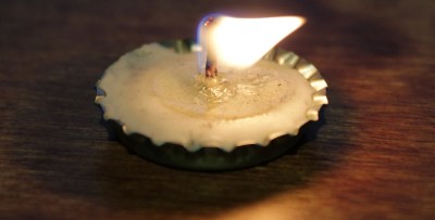 I ripped off a small amount of foil and squeezed it around the base of the wick, making sure it could stand up in the bottlecap. I carefully poured some of the wax into the cap–it doesn’t take much at all!