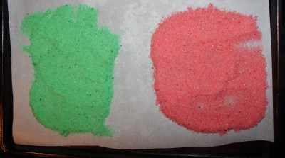 Put the parchment paper (again, NOT wax paper!!) on your baking pan. I did two colors at a time, and thinly spread them out on the paper (give them a mix first to make sure they didn’t clumped from sitting in the bowl). In hindsight I should have pre-cut the paper in half (made it easier to get back in the bowl at the end), but once it cooled I was able to carefully cut it.