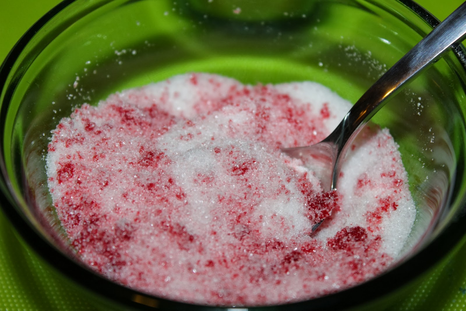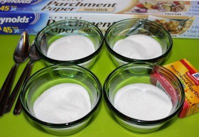 I got four smaller bowls, sugar, measuring cup, baking pan, food coloring, parchment paper, and grapefruit spoons (though I’m sure any spoon would work). The oven should be pre-heated to 310°F (which is 285°F in a convection oven).