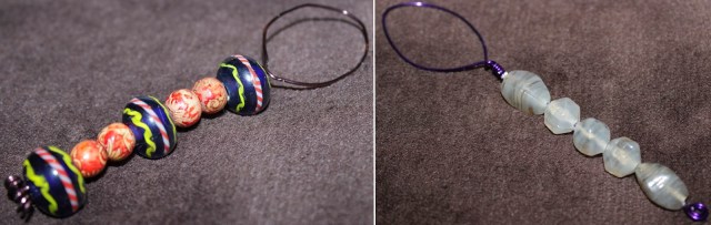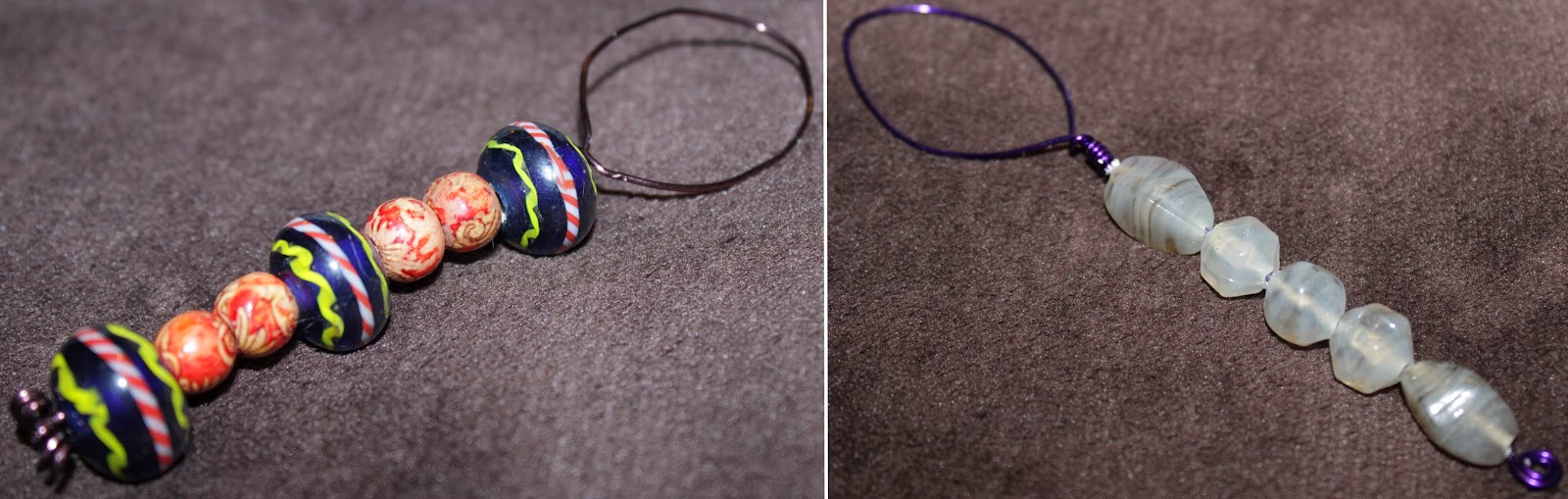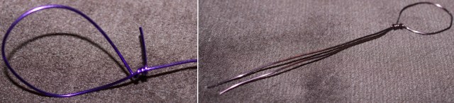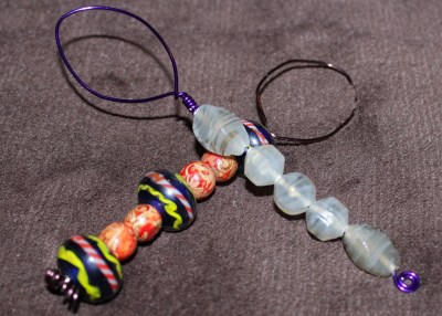 I made the purple by looping and wrapping the top then having a single wire at the bottom, and the brown by folding the wire in half, wrapping a few times, then having a double pronged bottom. Both I curled in after the beads were on; the purple with a flat spiral and the brown spiral curling outward.
