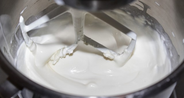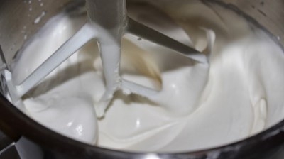 | With one cup of heavy cream added. You can still see the texture of the cream cheese mixing process on the paddle a bit. |