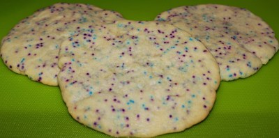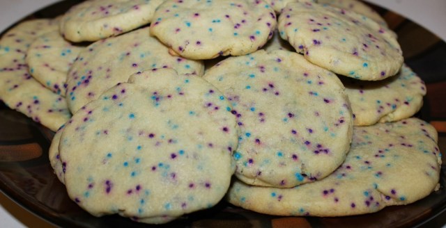 Today’s project was Sugar Sprinkles Cookies. Yes, these are just sugar cookies with sprinkles on them, but hey, I’ve never made homemade sugar cookies before (the husband normally does the baking) so it’s a first for me!