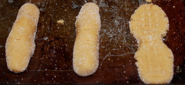 Today’s project was Homemade Nutter Butters. The recipe I used was from the Cookies and Cups blog. The only modifications I would do next time is use less than one-inch rolls (mine came out huge compared to hers) and one cup less powdered sugar in the filling (the taste is close, but too sweet). Our yield was about 33 sandwich cookies and they taste great. Pictures of the creation process are below!