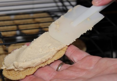 | Hubby adding the filling to a cookie. He advises having the filling at room temperature! |
