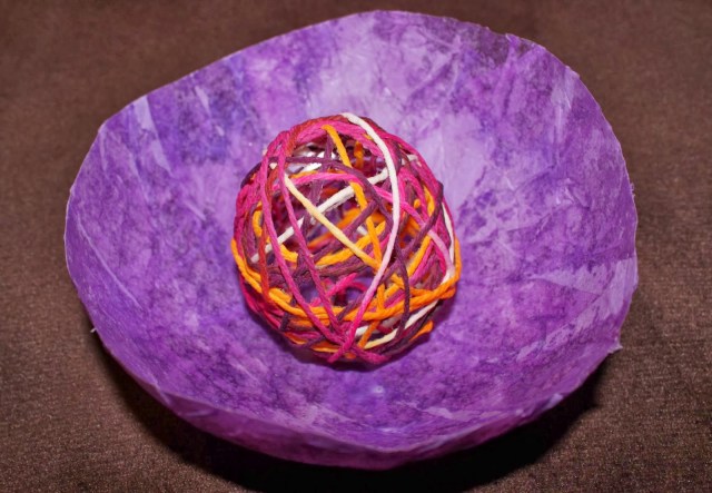 Today’s project was a Tissue Paper Bowl and a Yarn Egg. The bowl was done in the same style the Confetti Bowl would have been, using Mod Podge on a balloon. The Yarn Egg was an idea passed on to me by my friend Rijacki (check out her Facebook page here!) last night, and since I had the supplies I figured why the heck not?!