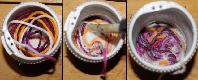 The yarn egg came first. You don’t need much water, try to make it a creamy glue mixture. I coiled my yarn in so it wouldn’t tangle then gently mushed it in well using the handle of my foam brush.