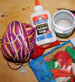 Next you get a pin and POP the balloons! The yarn egg balloon did not pop, and I discovered it may have been due to some of the yarn facing the balloon not being completely dry. Overall it held its shape, but because the balloon didn’t pop, my quarter didn’t get “trapped” in it. Oh well, next time!. 🙂