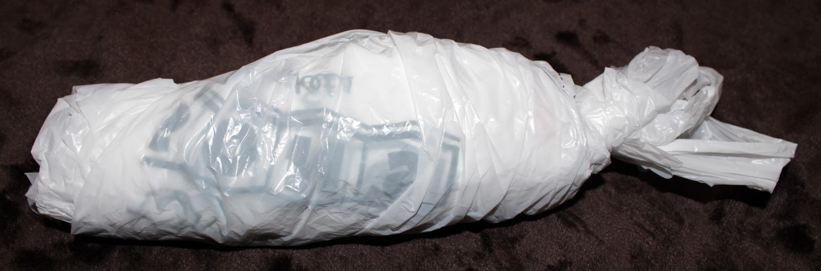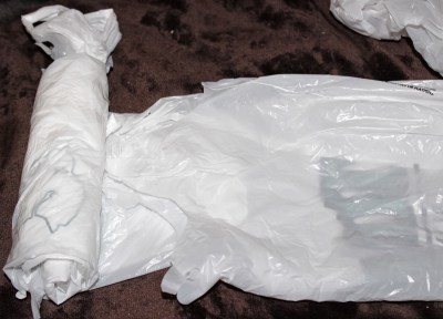 Today’s project was a Plastic Bag Dispenser, though it would be more accurately titled “Self-Dispensing Plastic Bags.” I used the bag rolling technique shown on the Tater Tots and Jello blog. Unlike their blog post, I didn’t have a container available to put them in, but considering how well the rolling technique worked I’ll be saving one to toss the bags into in the future!