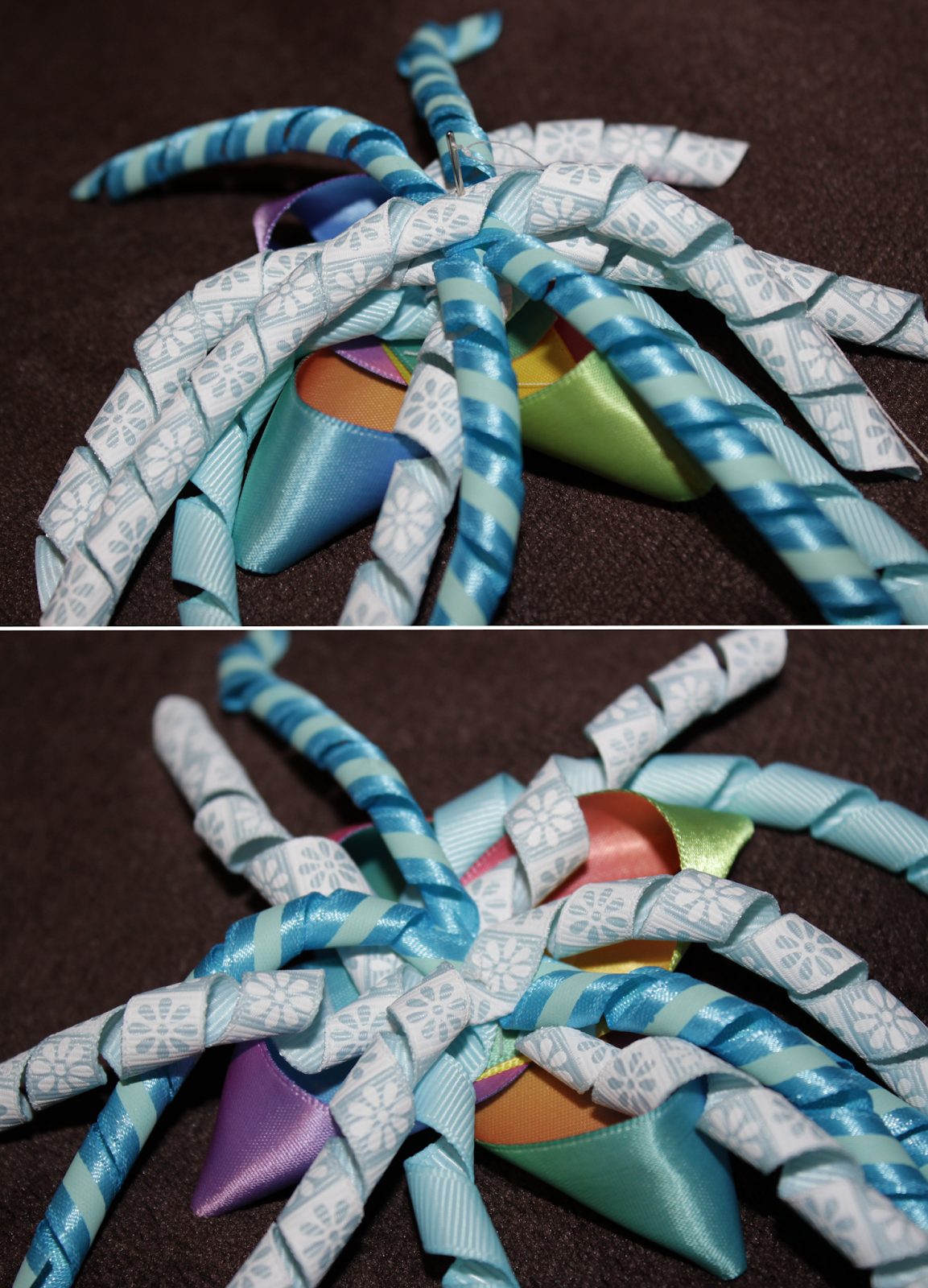 Center the needle on the inside center of your 7/8″ ribbon base. Push the needle all the way through, making a cross stitch that includes the korker ribbons. This is where you’ll want to use a thimble–pushing that needle through all of those ribbons can hurt!