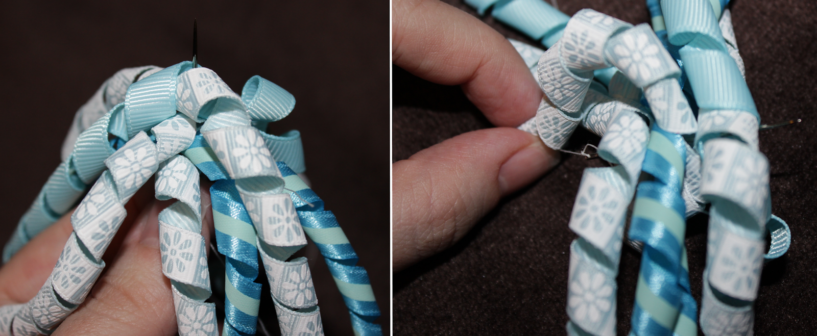 Do the same to the other length of 7/8″ ribbon, then cross them in an X shape, and stitch them together.