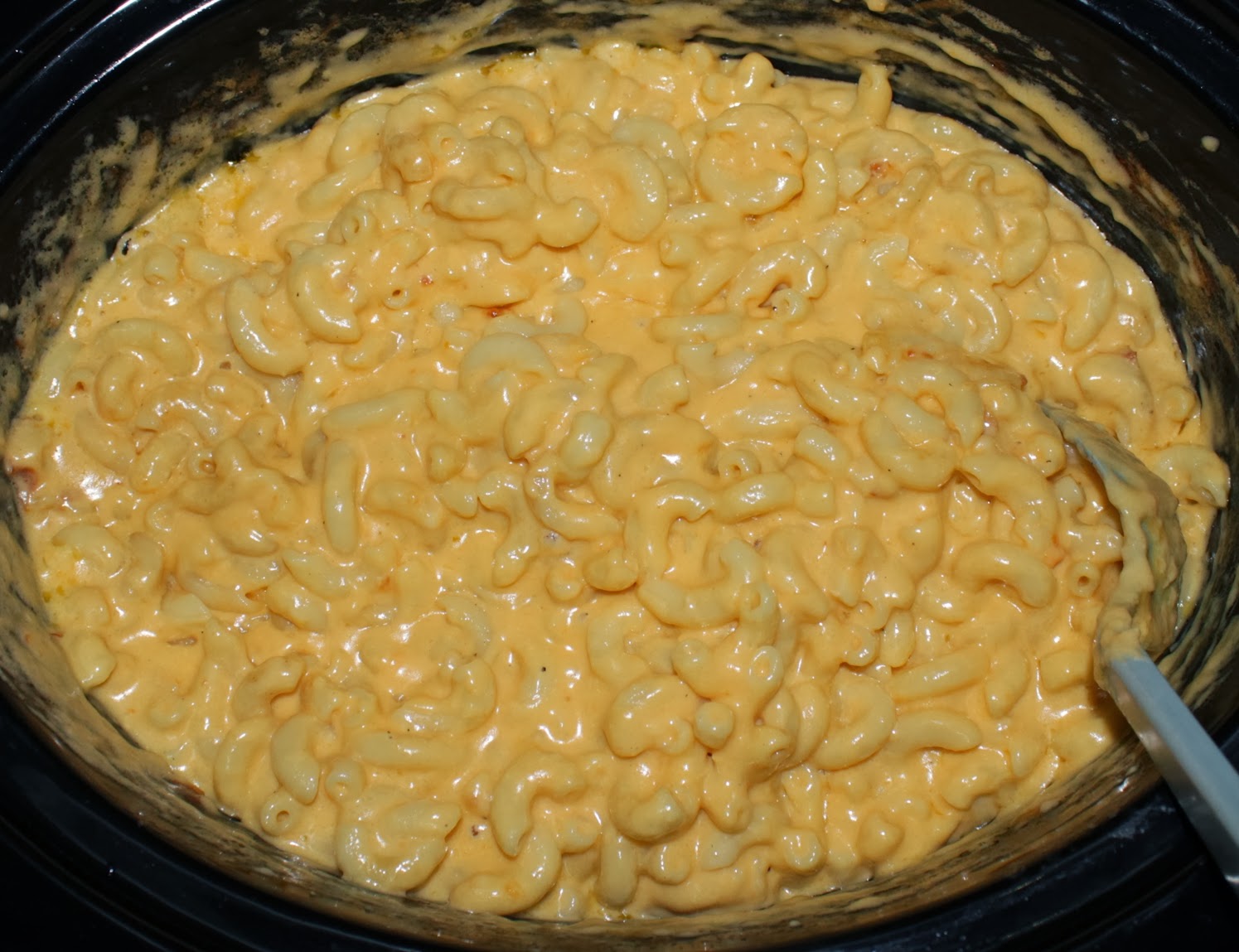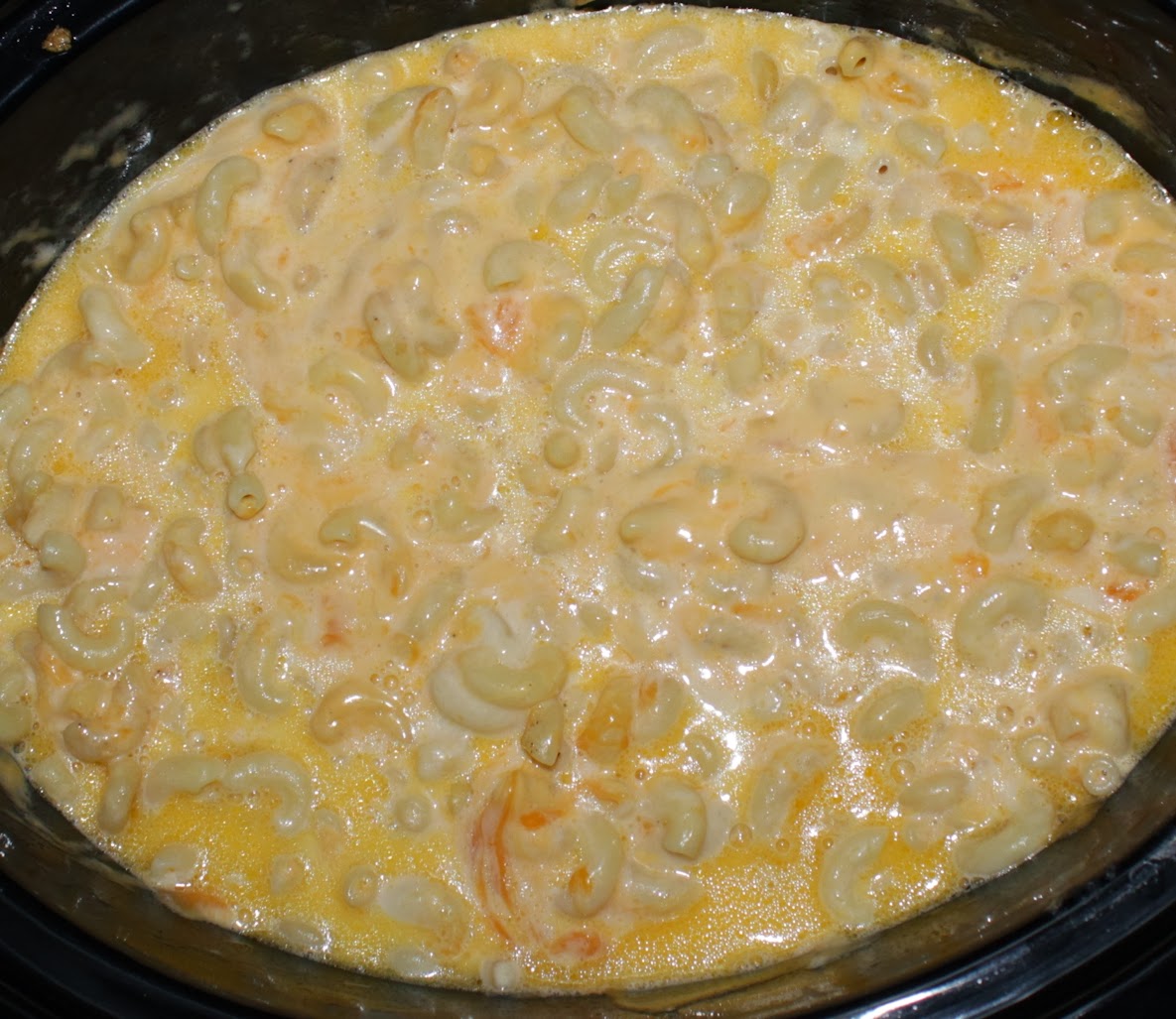 The recipe is simple: cook pasta, layer in crockpot with cheese and butter, add milk, cook for four hours on low, stirring at the 2-hour mark. I managed to partially screw one part up: I forgot to add the milk until the two hour mark, but at the end it still seemed to be blended appropriately anyway.