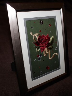 After adhering the rose iron-on with Mod Podge (any glue should work), I used some of my scrapbook embellishments to jazz it up and closed up the frame. I think I’ll send it to my mom for Mother’s Day this year!