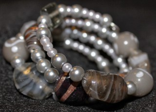 Today’s bracelet I call “Cloudy Skies“. It is a double-wrap featuring chunky grey swirl lampwork beads with white and grey pearls (similar) on silver memory wire.