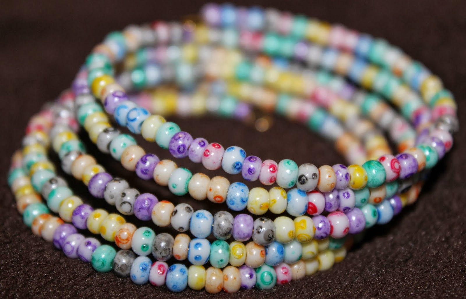 The “Candy Trail” quad-wrap gold memory wire bracelet features two strands of 6/0 czech seed beads. The beads are from a local shop and I can’t find them anywhere online, but Beadaholique has several lovely mixes, such as ‘Fall Harvest’ or ‘Rainbow Matte’!