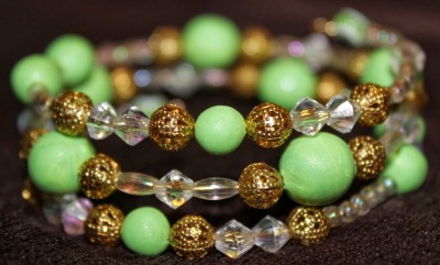 Today’s bracelet is a tri-wrap featuring handmade polymer clay beads, the color generated from a blend of blue and yellow Sculpey oven bake clay. It is accented by gold filagree spacer beads and acrylic clear AB beads (similar).