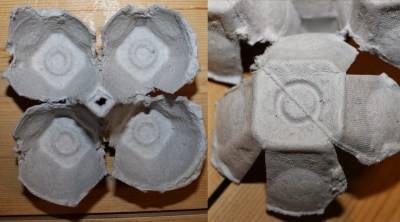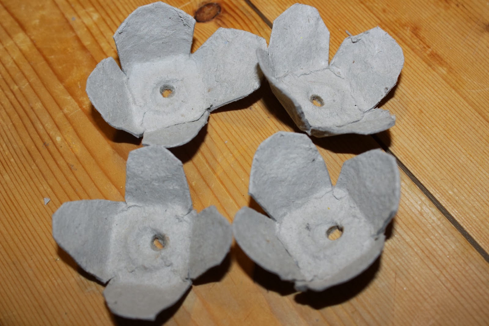 I cut out some egg cups and went for four simple, rounded petals on each. For the center hole I used an awl, but scissors should work fine as well.