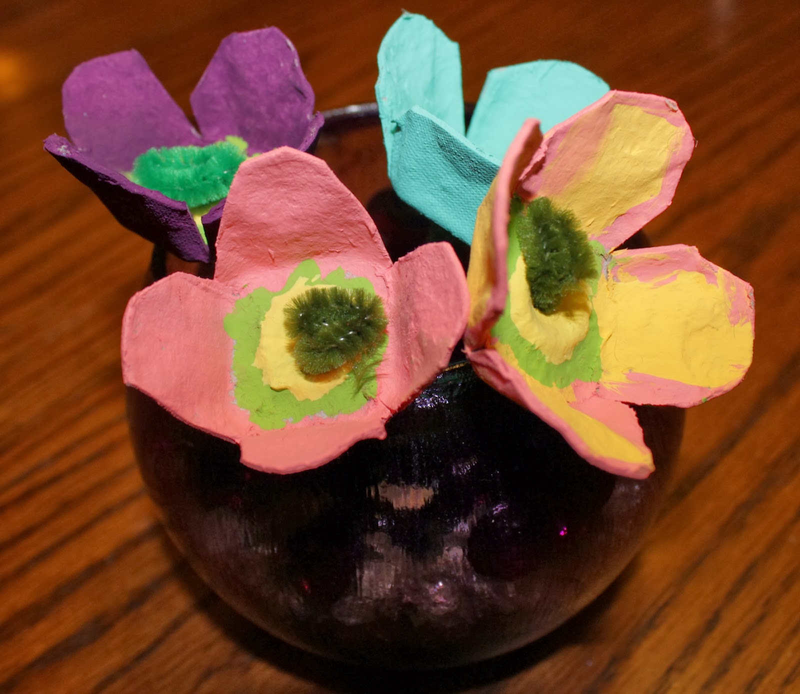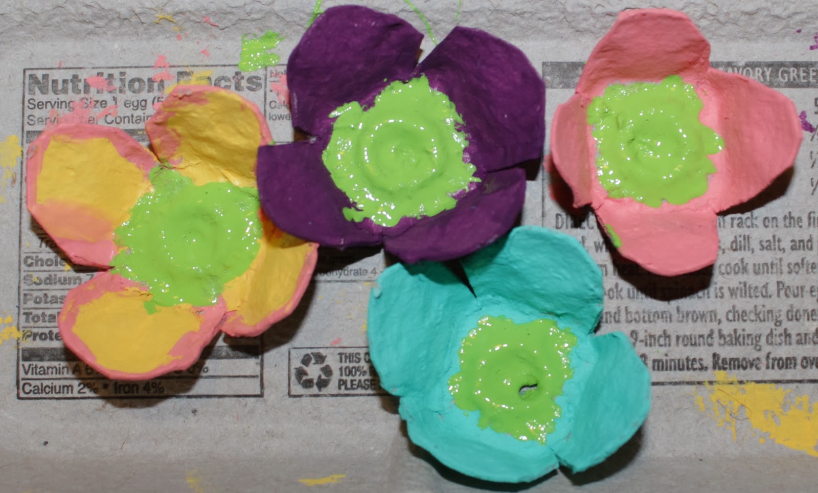 Today’s project was Egg Carton Flowers, inspired by this pin. When I started this we had an internet outage, so I had to go off of months-old memory for this one. This is a kid-friendly project, though depending on age you may want to pre-cut the cartons.