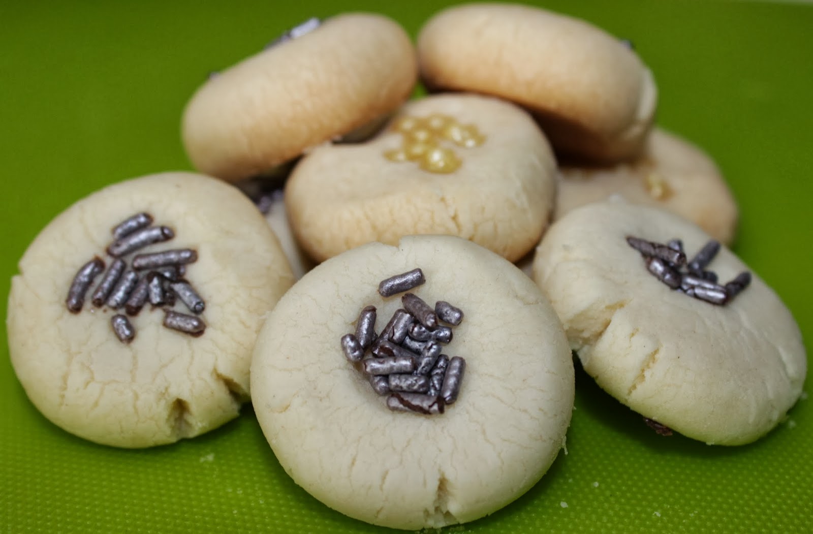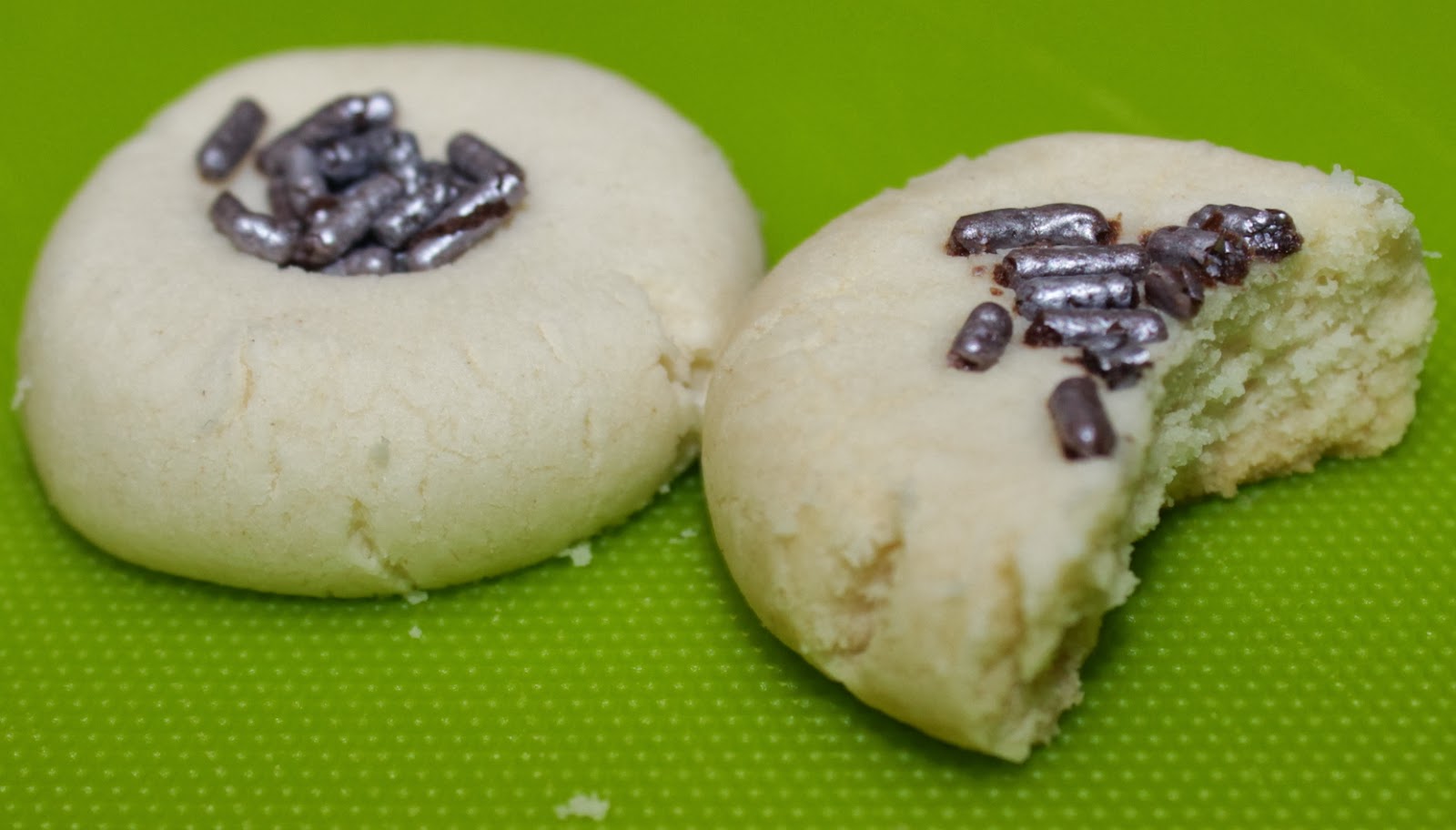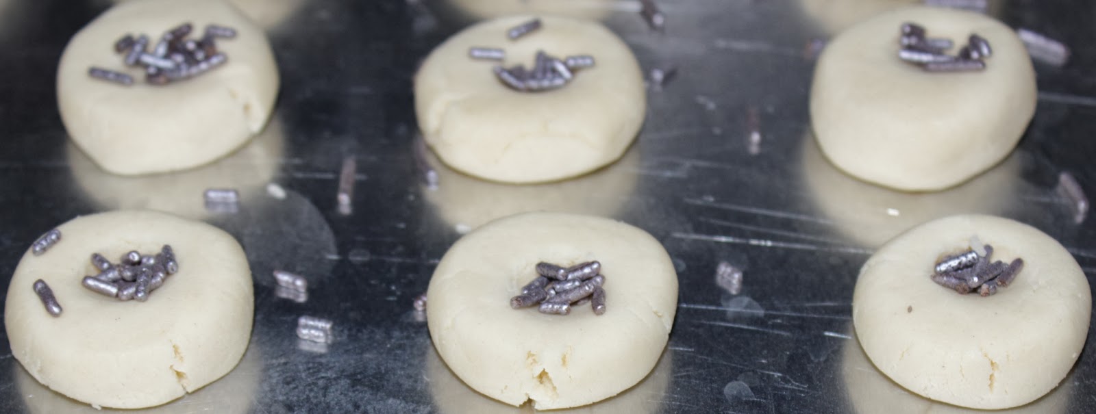 Roll the dough into 1″ balls and place about 1″ apart on ungreased baking sheets. We used our thumbs and the small spatula to partially flatten the balls, and left a small divet in the center for the sprinkles.