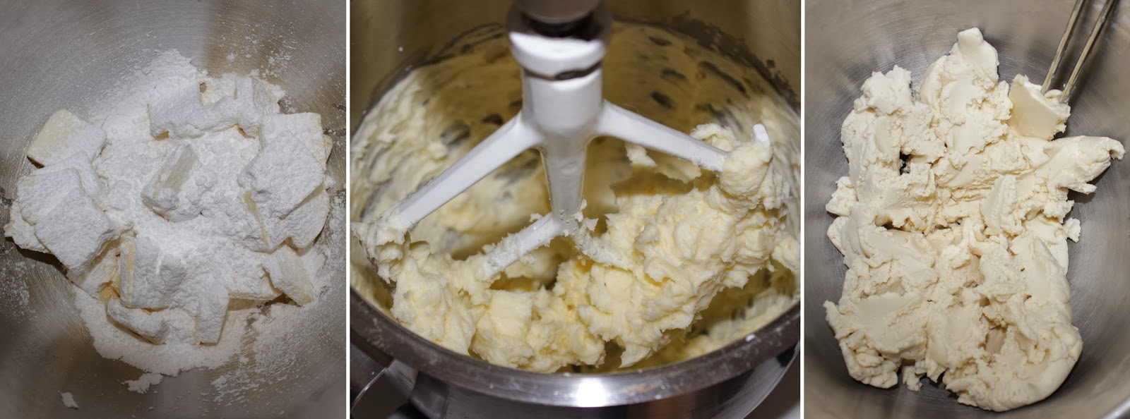 | Left to right: butter and sugar prior to mixing; fluffy butter/sugar mix; fully mixed dough |