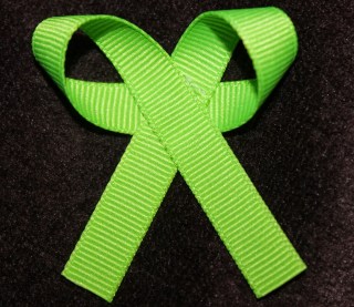 Take about 8″ of the green grosgrain ribbon and bring both ends up and over the center, letting the tails dangle down. Hot glue the ribbon to its center to keep it in place.