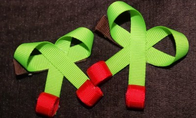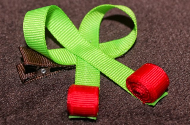 Today’s project was Cherry Clippies, inspired by this pin of a formerly listed Etsy item. To make it you need a hot glue gun, covered hair clip, 3/8″ green grosgrain ribbon and 3/8″ red grosgrain ribbon.