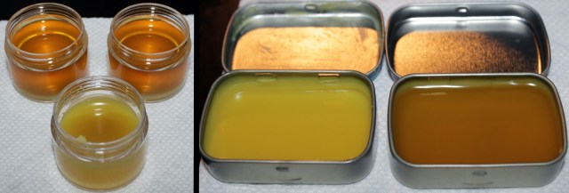 3. Very carefully pour into your containers, or use a dropper/pipette if you have one. If you’re using tins with hinges, be careful to not fill at or above the hinges as it can overflow (I learned this the hard way)