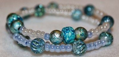 The “Crackling Blue” bracelet features blue crackle beads (similar), blue lampwork beads and 6/0 Czech seed beads.