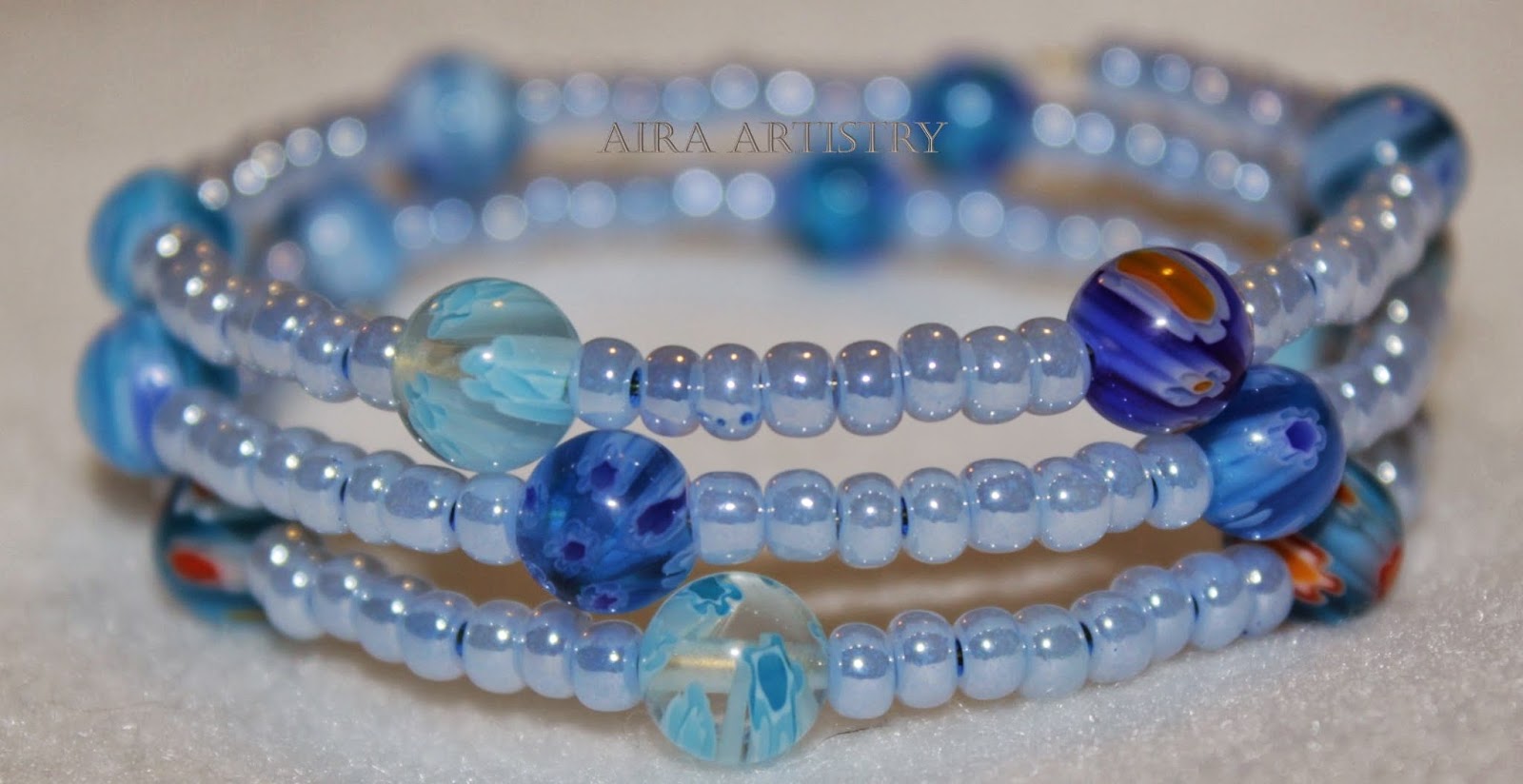Today’s “Blue Swirl” bracelet features dark and light blue Millefiori beads (similar) with 6/0 Czech seed beads.
