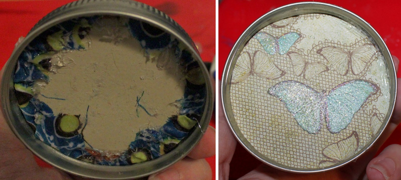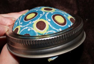 Place the inside lid on top and slowly push everything in. It should bulge out of the screw lid a bit. Tug the fabric from the inside gently to ensure a tight fit and trim any gross excess.