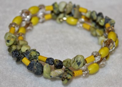 This memory wire bracelet features vintage 1970s yellow wooden beads with serpentine gemstone chip beads.