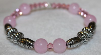 The “Cotton Candy Splash” single-wrap bracelet features 8mm pink acrylic beads and 4mm pink Swarovski bicones.