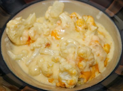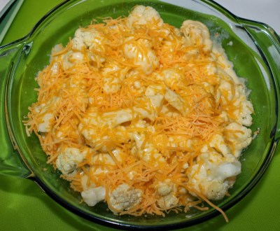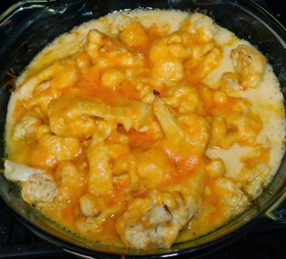 At this point the recipe calls for an 8×8-inch glass baking dish or four 10 oz ramekins. I had neither, but I did have a 8.25″ diameter glass dish, and that worked out just fine. Whatever you’re using, first add the cauliflower, then pour the cheese sauce in, and finally sprinkle your remaining 2 tbsp cheddar cheese on top.