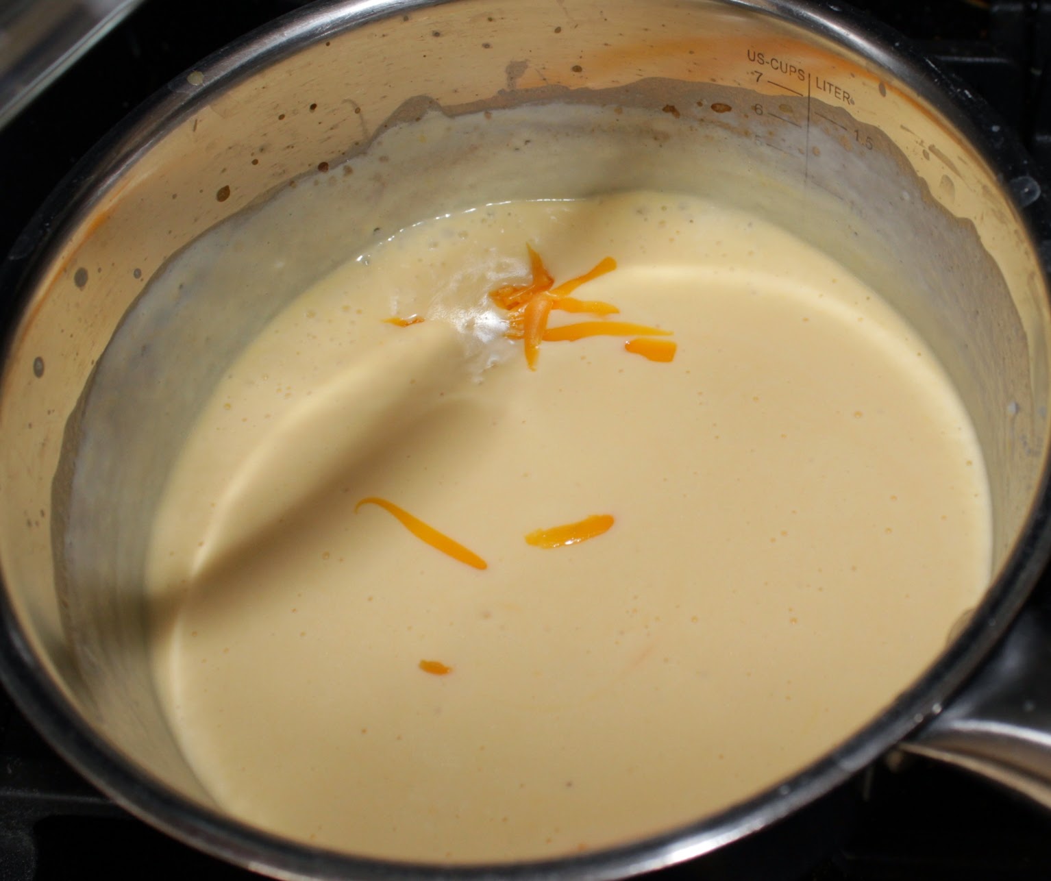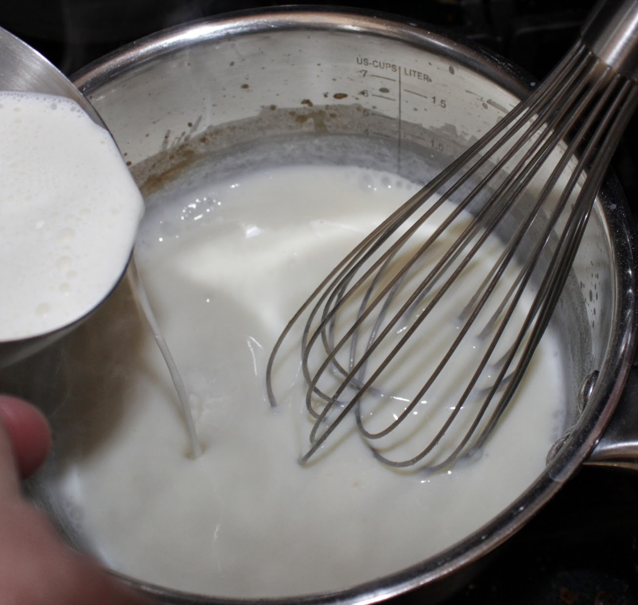 Melt your unsalted butter in a medium skillet over medium heat. Stir in the flour and cook for 1 minute. Slowly whisk in the milk and simmer over medium heat, stirring frequently for about 2 minutes until it thickens. Add the heavy cream, whisking it into your mix, and cook about 3-5 minutes.